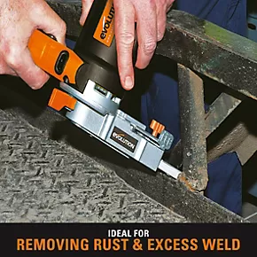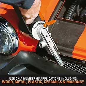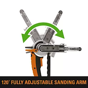 Versatile performance sander with adjustable arm and variable speed for various materials. Ideal for sanding, filing and sharpening tool blades. Perfect for use in confined spaces. Brushes are replaceable.